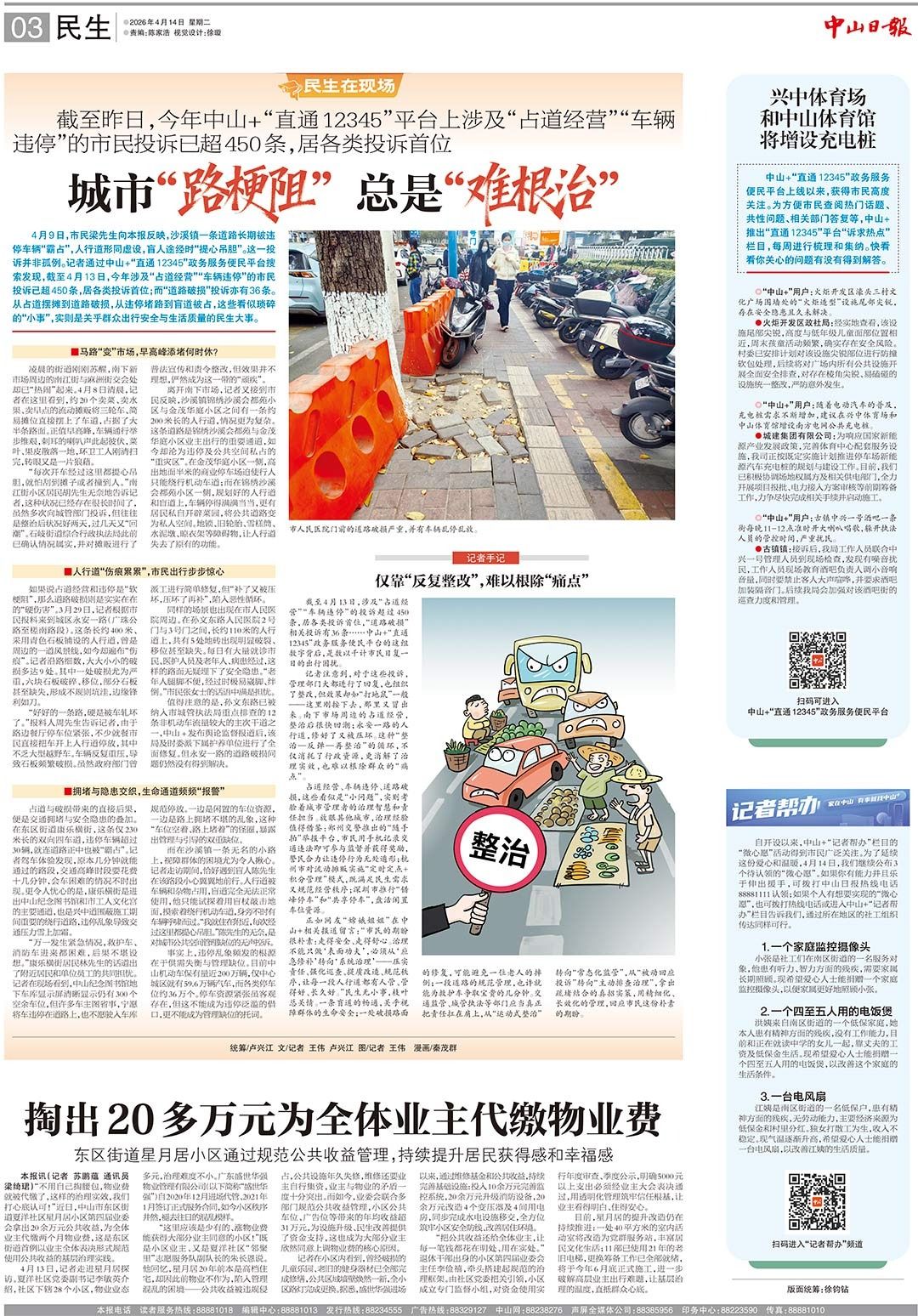 截至4月13日,涉及“占道經(jīng)營”“車輛違停”的投訴超過450條,居各類投訴首位,“道路破損”相關(guān)投訴有36條……中山+“直通12345”政務(wù)服務(wù)便民平臺的這組數(shù)字背后,是數(shù)以千計(jì)市民日復(fù)一日的出行困擾。