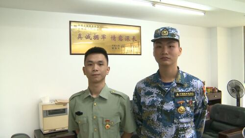 身穿綠色軍裝的叫余英維,旁邊穿迷彩服的是鄧爾康。中學(xué)的時候,他們就一起上學(xué),2017年,高中一畢業(yè)就攜手一起報名圓了心里的軍旅夢。