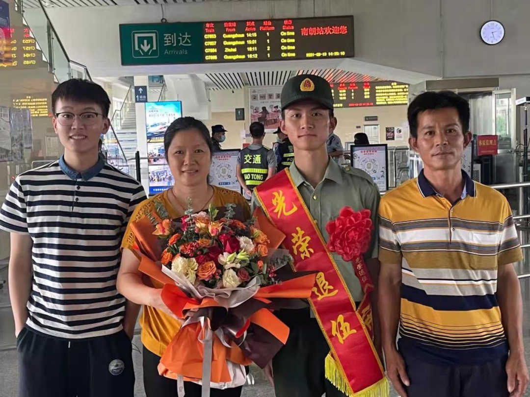 “去時鑼鼓喧天,歸來夾道歡迎?!?/p> 九月,正是退役軍人 從祖國各座軍營 返回家鄉(xiāng)的退役季 為營造“一次參軍、一生光榮”的濃厚氛圍 讓退役軍人感受到家鄉(xiāng)人民的熱情和關(guān)懷 激發(fā)老兵退伍不褪色 返鄉(xiāng)建新功的壯志熱情 9月13日下午,五桂山街道2021年首位退役軍人曾世紀(jì)光榮退役返鄉(xiāng)。街道退役軍人服務(wù)中心負(fù)責(zé)人、社區(qū)“兩委”干部、工作人員以及曾世紀(jì)的父母早早手持鮮花,在城軌南朗站等候迎接世紀(jì)回家。 回想2019入伍歡送大會時曾世紀(jì)代表五桂山即將入伍的新兵作表態(tài)發(fā)言,那年,他主動請纓,到艱苦邊遠(yuǎn)地區(qū)服役?!皡④姴粌H是個人的榮耀,也是家人的榮耀,更是鄉(xiāng)親們的榮耀。到了部隊后我會堅決服從命令,聽從指揮,刻苦訓(xùn)練,勤學(xué)本領(lǐng),絕不辜負(fù)家鄉(xiāng)人民的期望!”