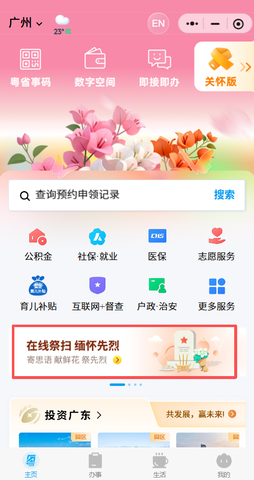 1、進(jìn)入粵省事后,在首頁(yè)往下滑動(dòng)至熱門服務(wù)下方的“推廣入口”區(qū)域,然后左右滑動(dòng),可見(jiàn)“在線祭掃 緬懷先烈”的圖片入口?;蛟谒阉鳈谳斎?strong>“英烈在線祭掃”進(jìn)入。