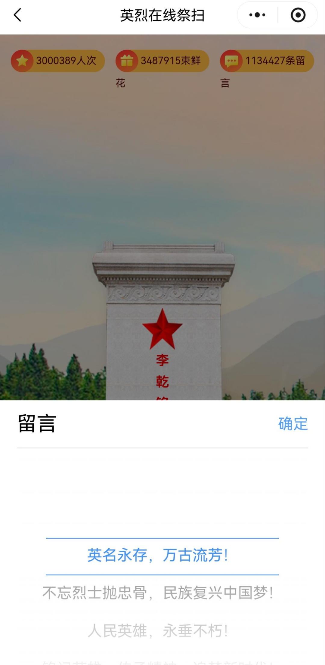 點(diǎn)擊【網(wǎng)上祭英烈】→選擇區(qū)域或英烈姓名,點(diǎn)擊【搜索】→查看英烈名錄,點(diǎn)擊英烈姓名進(jìn)行祭掃→點(diǎn)擊【生平】,可查看英烈生平及生前事跡→點(diǎn)擊【留言】,緬懷英烈→選擇【留名留言】或【不留名留言】→點(diǎn)擊【獻(xiàn)花】,可為英烈獻(xiàn)花。