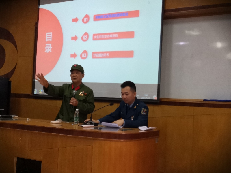 李金洪與陳偉樂兩代退役軍人同臺講述崢嶸歲月。 由于身體不適,李金洪無法長時間親述那段崢嶸歲月,但是這位老兵又是那么熱心地想讓更多后輩知道祖國的不容易,人民當今幸福生活的來之不易,毅然接受邀請,克服身體不適,再次走上講臺,結合親身經(jīng)歷給在場師生講述1979年那段崢嶸歲月。李金洪表示,軍人的使命是保衛(wèi)祖國,抵抗侵略,“如果再給我選擇的機會,我還是義無反顧上戰(zhàn)場,我們有偉大的共產(chǎn)黨、有偉大的制度、有偉大的祖國和人民,我們應該為自己是一名中國人和生活在祖國的大地上感到驕傲和自豪”。 此次宣講活動中,李金洪多了一個戰(zhàn)友,他叫陳偉樂,是駐香港部隊的退役軍人,也是神灣鎮(zhèn)退役軍人服務中心的工作人員,李金洪和陳偉樂雖然是不同時代的退役軍人,但是有著同一個方向,就是對黨、祖國和人民無限的愛。李金洪身體不適,陳偉樂就來充當他的“傳聲筒”,將一段段難忘經(jīng)歷分享給廣大師生們。