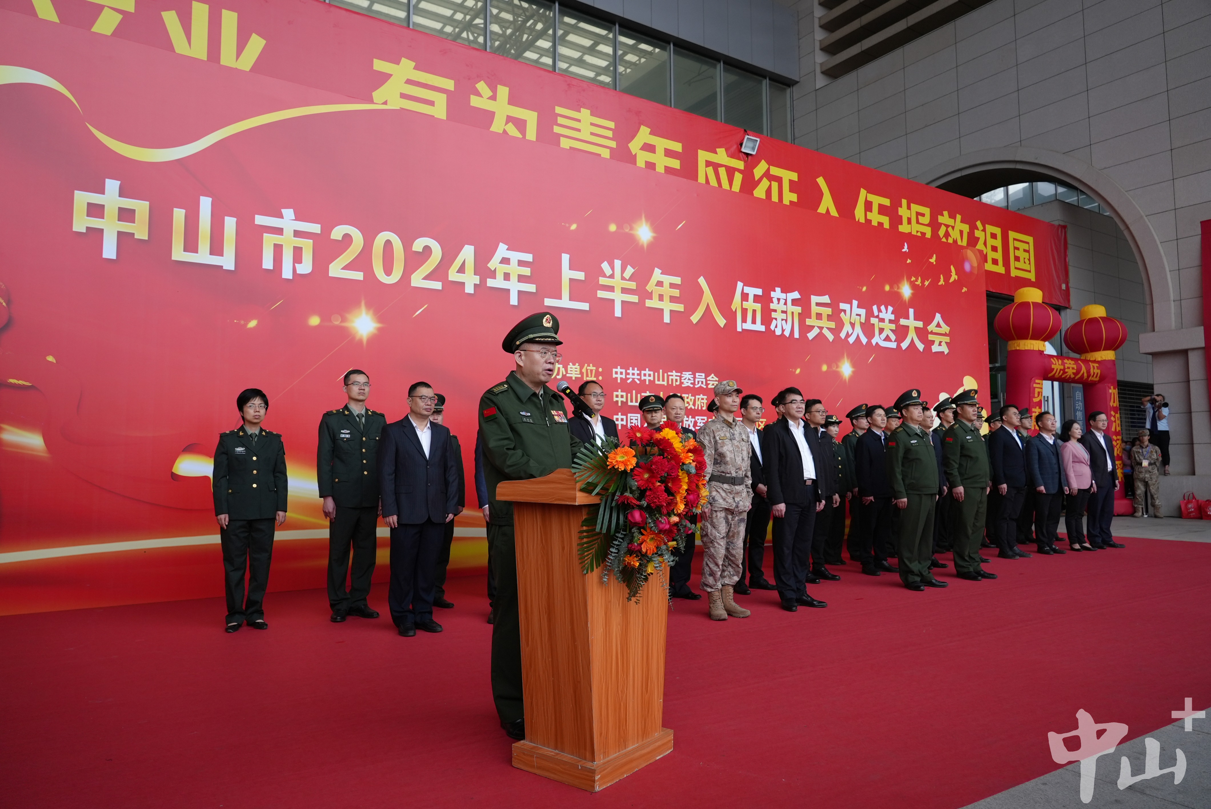來自古鎮(zhèn)的新兵鄒卓航在新兵發(fā)言中表態(tài),要用實際行動回報家人的期盼,為中山爭光添彩,為祖國的國防事業(yè)作出貢獻。 新兵余焱鵬的爸爸余如意是一名退役軍人,他在歡送大會上深情囑咐新兵們:“希望你們到部隊后安心服役,以優(yōu)異的成績向家鄉(xiāng)人民匯報,對得起你們身上穿的這身軍裝。”  中山市征兵工作領導小組副組長、中山軍分區(qū)大校司令員李云濤致辭。記者 易承樂 攝