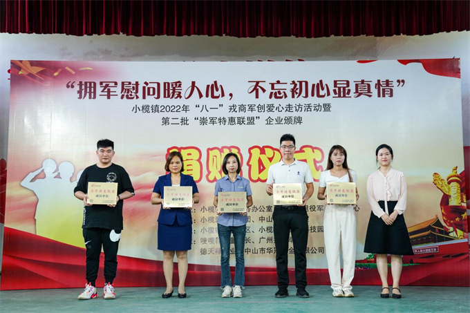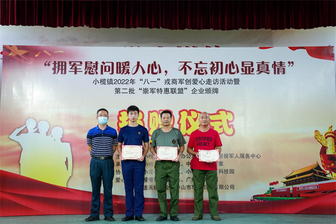 7月24日,小欖鎮(zhèn)舉行“擁軍慰問暖人心,不忘初心顯真情”——2022年“八一”愛心走訪活動啟動暨第二批“崇軍特惠聯(lián)盟”企業(yè)頒牌儀式。該鎮(zhèn)副鎮(zhèn)長鄧泳標(biāo)、市退役軍人服務(wù)中心副主任高亞男及鎮(zhèn)公共服務(wù)辦、退役軍人服務(wù)中心、高沙社區(qū)、中山好人工作室相關(guān)負(fù)責(zé)人,小欖愛心助學(xué)團志愿者、愛心企業(yè)及第二批市“崇軍特惠聯(lián)盟”企業(yè)的代表以及部分優(yōu)秀退役軍人代表近100人參加了活動。