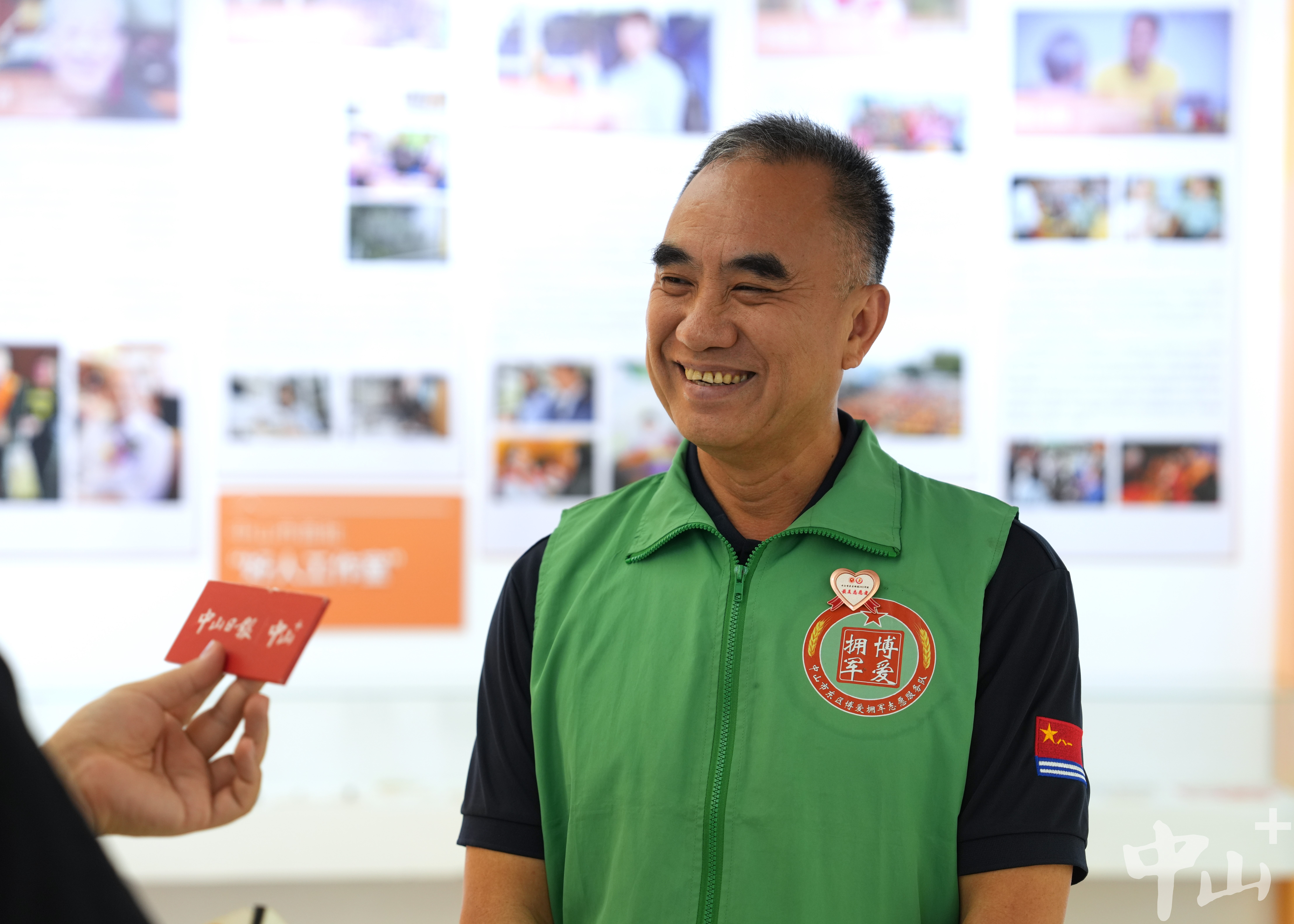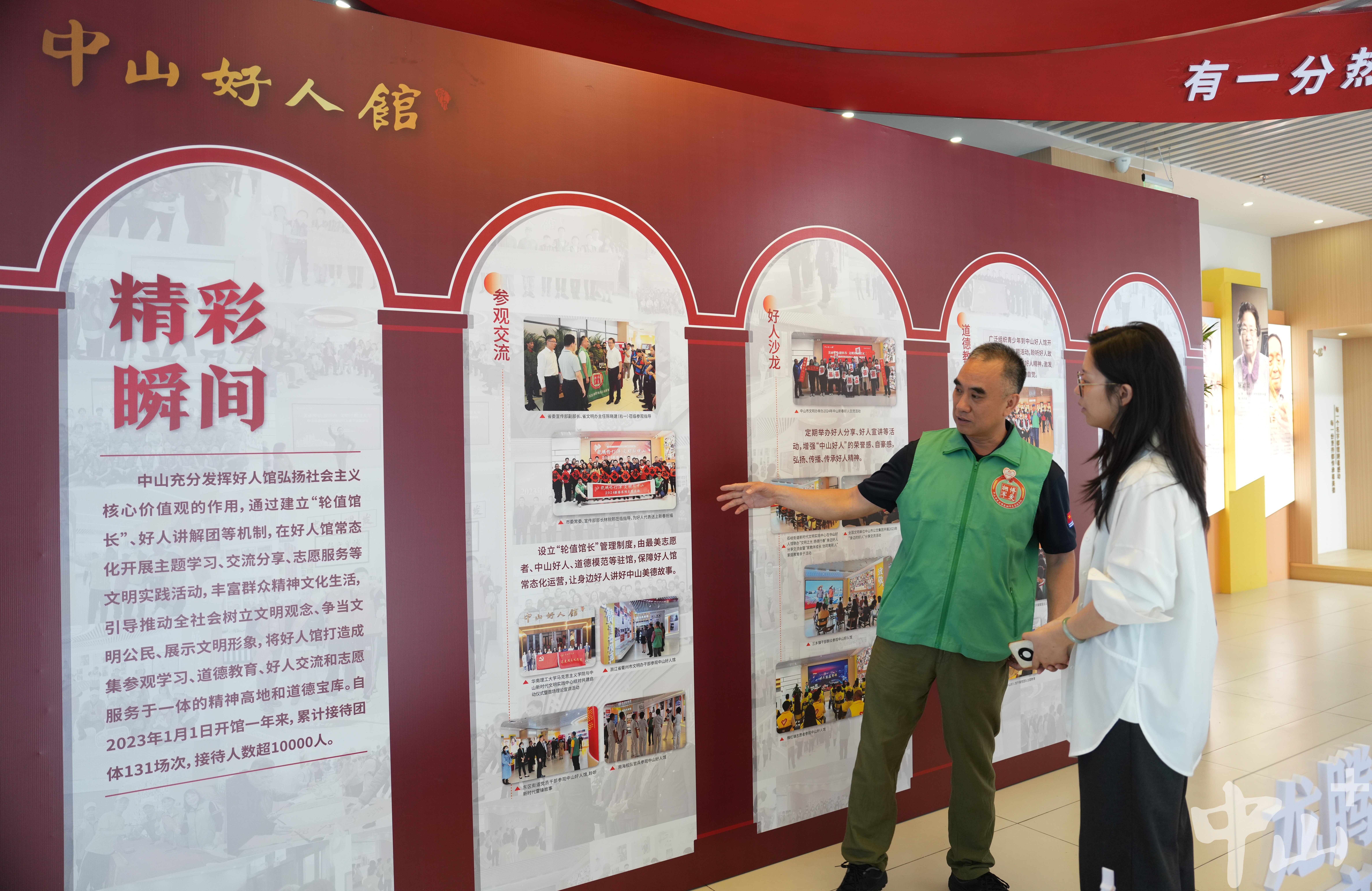 作為一名退伍軍人,李克有很多曾一起在戰(zhàn)場(chǎng)上出生入死的戰(zhàn)友,其中不乏已經(jīng)為國(guó)捐軀的烈士。自2007年起,他便自發(fā)組織尋找犧牲的中山籍戰(zhàn)友,先后6次帶隊(duì)前往廣西邊境的多個(gè)烈士陵園,成功尋到29名犧牲戰(zhàn)友信息,并將相關(guān)信息報(bào)送給中山市退役軍人事務(wù)局。 “我有一位戰(zhàn)友,寧愿把生的希望留給其他人,19歲不到就犧牲在戰(zhàn)場(chǎng)上。他們已經(jīng)離我們而去,更重要的是我們能為他們做些什么。所以逢年過(guò)節(jié)我都會(huì)看望他們的家人,把歡樂(lè)也帶給老人家?!崩羁苏f(shuō)。 2016年,得知戰(zhàn)友的女兒患先天性心臟病,須進(jìn)行心肺聯(lián)合移植手術(shù),李克立即帶頭捐款,并聯(lián)系政府相關(guān)部門和電視臺(tái),通過(guò)媒體報(bào)道讓更多愛心人士關(guān)注到了這位困難老兵。在他的多方奔走下,社會(huì)各界紛紛伸出援助之手,募集醫(yī)藥費(fèi)40余萬(wàn)元,助戰(zhàn)友的女兒順利完成了手術(shù)。 牽頭成立志愿服務(wù)隊(duì) 延續(xù)志愿精神 作為一名有著30多年志愿服務(wù)經(jīng)歷的資深志愿者,李克的生活已經(jīng)與志愿分不開。他的身上始終有一抹綠色:在軍營(yíng),是守衛(wèi)國(guó)門的綠軍裝;在社區(qū),是服務(wù)群眾的綠馬甲。在人民群眾需要的地方,李克每次都沖在最前線。 “2020年疫情暴發(fā)時(shí),很多人都響應(yīng)號(hào)召待在家里,我覺得作為一個(gè)打過(guò)仗的老兵,我總得站出來(lái)做點(diǎn)事?!睕](méi)有過(guò)多考慮,李克第一時(shí)間加入到了志愿者隊(duì)伍中,并在社區(qū)堅(jiān)守了整整60天。當(dāng)時(shí)防護(hù)物資匱乏,李克還自掏腰包托人在廣州購(gòu)買了6萬(wàn)元左右的防護(hù)物資,全部捐贈(zèng)給了在一線抗疫的工作人員。 近年來(lái),李克還積極捐資助學(xué)、支援災(zāi)區(qū)、扶危濟(jì)困,連續(xù)6年資助6名困難學(xué)生,為汕尾市陸河中學(xué)捐贈(zèng)10套多媒體電腦設(shè)備,堅(jiān)持參與無(wú)償獻(xiàn)血直到60歲。 2018年起,李克擔(dān)任文明城市巡查監(jiān)督員,奔走在街道各個(gè)路口、每條小巷,整理亂停亂放的共享單車,清理“牛皮癬”小廣告,保障街頭巷尾干凈衛(wèi)生。同一年,為更有組織地開展志愿活動(dòng),李克牽頭成立了一支以退役軍人為主導(dǎo)的東區(qū)博愛擁軍志愿服務(wù)隊(duì),把戰(zhàn)友們凝聚在一起,共同為社會(huì)作貢獻(xiàn)。如今,這支志愿服務(wù)隊(duì)已從最初的8名成員,逐漸壯大至400多人,成為服務(wù)社會(huì)的一支生力軍。 講好好人故事,傳承紅色文化 4月19日上午,記者在“中山好人館”見到了正在擔(dān)任“輪值館長(zhǎng)”的李克。從去年1月開始,他每個(gè)月都參與輪值,先后為140多場(chǎng)活動(dòng)、1萬(wàn)多名市民群眾義務(wù)講解博愛之城的凡人善舉、好人大愛。  正在中山好人館輪值的李克。記者 劉萬(wàn)杰 攝