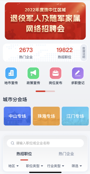 2022年度珠中江區(qū)域退役軍人及隨軍家屬網(wǎng)絡(luò)招聘會(huì)頁(yè)面。 主頁(yè)分設(shè)城市宣傳專(zhuān)區(qū)、政策宣傳專(zhuān)區(qū)、崗位發(fā)布入口、求職登記入口、求職訂閱服務(wù)、在線測(cè)評(píng)共六大功能板塊。 招聘會(huì)設(shè)置退役軍人就業(yè)指導(dǎo)員,根據(jù)就業(yè)及企業(yè)需求調(diào)研結(jié)果,對(duì)有求職意向的退役軍人和隨軍家屬提供精準(zhǔn)匹配及推送、政策咨詢、簡(jiǎn)歷指導(dǎo)、崗位推薦等就業(yè)指導(dǎo)服務(wù)。 一、求職登記流程 1、求職登記 手機(jī)掃碼進(jìn)入【2022年度珠中江區(qū)域退役軍人及隨軍家屬網(wǎng)絡(luò)招聘會(huì)】,電腦端可通過(guò)文章左下方原文鏈接進(jìn)入專(zhuān)場(chǎng)。點(diǎn)擊【求職登記】即可登記,登記成功后,企業(yè)HR可以通過(guò)平臺(tái)與求職者聯(lián)系溝通。