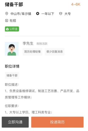 ▲求職者注冊(cè)流程 3、投遞簡(jiǎn)歷 完善注冊(cè)信息后,即可跳轉(zhuǎn)至【2022年度珠中江區(qū)域退役軍人及隨軍家屬網(wǎng)絡(luò)招聘會(huì)】,點(diǎn)擊職位名稱(chēng)可進(jìn)入相應(yīng)職位詳情頁(yè),點(diǎn)擊企業(yè)可進(jìn)入企業(yè)詳情頁(yè),可查看企業(yè)發(fā)布的在線職位。 點(diǎn)擊職位詳情頁(yè)左下方【立即溝通】可和HR進(jìn)行溝通,點(diǎn)擊右下方【投遞簡(jiǎn)歷】即可完成投遞。