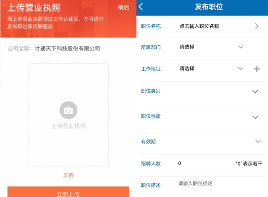 ▲企業(yè)注冊(cè)流程 2、發(fā)布職位 完善注冊(cè)信息后,即可進(jìn)入到【企業(yè)會(huì)員中心管理后臺(tái)】,發(fā)布職位前【上傳營(yíng)業(yè)執(zhí)照】,【通過(guò)審核后】即可發(fā)布職位,企業(yè)發(fā)布的符合條件的崗位將同步更新至【2022年度珠中江區(qū)域退役軍人及隨軍家屬網(wǎng)絡(luò)招聘會(huì)】