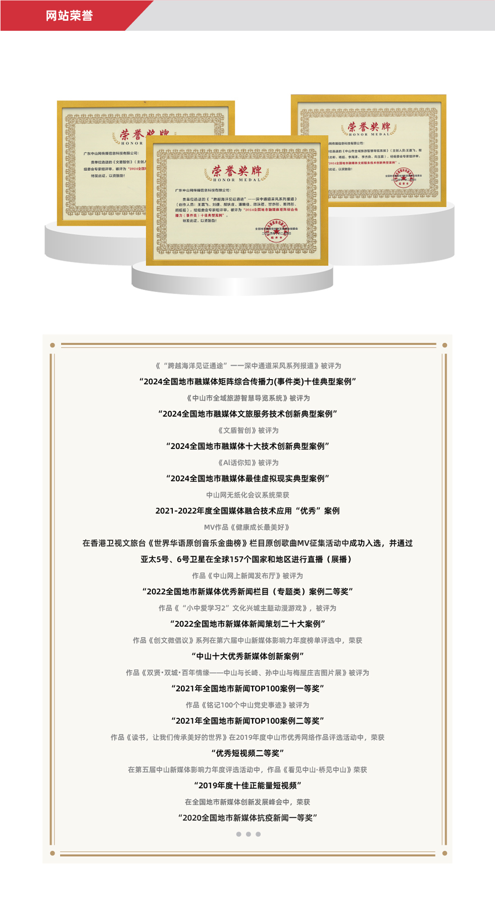 為積極響應(yīng)國(guó)家文化體制改革,2012年中山網(wǎng)信科應(yīng)運(yùn)而生,是中山日?qǐng)?bào)社全資一級(jí)企業(yè)。經(jīng)過(guò)十多年的發(fā)展,中山網(wǎng)信科已成長(zhǎng)為國(guó)家高新技術(shù)企業(yè)、廣東省專(zhuān)精特新中小企業(yè),擁有互聯(lián)網(wǎng)新聞信息服務(wù)許可證、信息網(wǎng)絡(luò)傳播視聽(tīng)節(jié)目許可證、增值電信業(yè)務(wù)經(jīng)營(yíng)許可證等國(guó)家、省、市級(jí)行業(yè)許可,是本地證照最為齊全的新聞機(jī)構(gòu)之一。