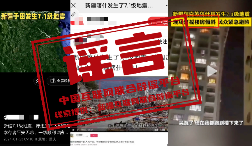 詳情:1月23日2時9分,新疆阿克蘇地區(qū)烏什縣發(fā)生7.1級地震。隨后,關于此次地震的各種不實信息在網絡上傳播,混淆視聽、引發(fā)關注。針對“新疆喀什發(fā)生7.1級地震”“新疆和田地區(qū)于田縣發(fā)生7.1級地震”的網傳信息,經喀什市應急管理局和于田縣應急管理局證實,1月23日兩地均未發(fā)生地震,信息為虛假不實內容;針對“阿克蘇某小區(qū)樓被地震晃歪了”的圖文信息,經相關部門核實,圖片中的建筑物為阿克蘇市鳳凰城小區(qū)居民樓,排查暫未發(fā)現地震造成該樓體傾斜,網傳圖片系建筑物樓體設計和拍攝角度造成的樓體傾斜視覺錯誤;針對上述圖片和視頻顯示的“烏什縣路面損毀嚴重、房屋連片倒塌”相關信息,經查是網民利用AI自動生成技術,將烏什縣7.1級地震有關信息與網絡舊圖合成的虛假信息。中國互聯網聯合辟謠平臺提醒廣大網民,以官方發(fā)布信息為準,自覺抵制網絡謠言。(來源:“和田網絡舉報辟謠”微信公眾號、“喀什市零距離”微信公眾號、“阿克蘇網絡舉報”微信公眾號)