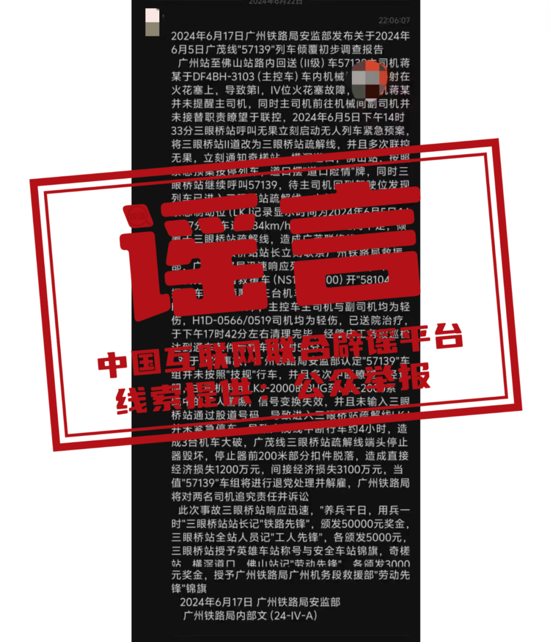 辟 謠  網(wǎng)傳“廣州鐵路局安監(jiān)部2024年6月5日廣茂線57139列車(chē)傾覆初步調(diào)查報(bào)告”為虛假信息