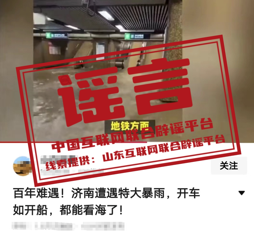 真相:7月22日,一則內(nèi)容為“百年難遇!濟(jì)南遭遇特大暴雨,開車如開船”的視頻信息在網(wǎng)絡(luò)傳播,視頻中還摻雜“車庫倒灌”“地鐵被淹”等水災(zāi)畫面。經(jīng)當(dāng)?shù)叵嚓P(guān)部門核實(shí),濟(jì)南市氣象臺于22日11時(shí)解除雷雨大風(fēng)黃色預(yù)警信號,當(dāng)日并未出現(xiàn)特大降雨情況。視頻中的地鐵、街道等場景不在濟(jì)南。該視頻信息為謠言。(來源:山東互聯(lián)網(wǎng)聯(lián)合辟謠平臺、濟(jì)南互聯(lián)網(wǎng)聯(lián)合辟謠平臺)