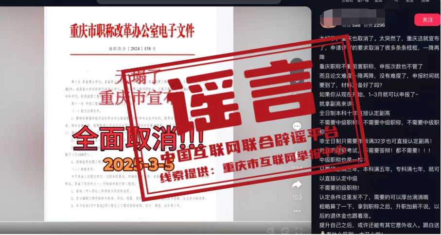 真相:近日,有網(wǎng)民在互聯(lián)網(wǎng)平臺發(fā)布消息稱“重慶市宣布,申請評審的要求取消了很多條條框框,職稱申請不看前置職稱,全日制本科十年直接認(rèn)定副高,不需要中級職稱”,引發(fā)關(guān)注。經(jīng)核實(shí),網(wǎng)傳信息系謠言。職稱評審均需逐級晉升,取得上一級職稱并滿足相應(yīng)學(xué)歷資歷條件后方可晉升高一級職稱。目前重慶市除特殊人才、博士后等3個針對特定對象的職稱申報綠色通道外,正常申報通道均需逐級晉升。網(wǎng)傳文件是網(wǎng)民通過P圖軟件編輯而成,試圖吸引不明真相的群眾咨詢,借機(jī)推銷職稱代辦服務(wù),收取高額費(fèi)用。目前,謠言線索已轉(zhuǎn)交公安機(jī)關(guān)進(jìn)一步調(diào)查處置。(來源:“重慶辟謠”微信公眾號)