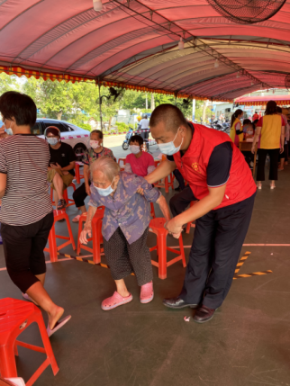 阜沙鎮(zhèn)綜合治理辦主任關(guān)國(guó)勝協(xié)助長(zhǎng)者開(kāi)展核酸檢測(cè)工作。